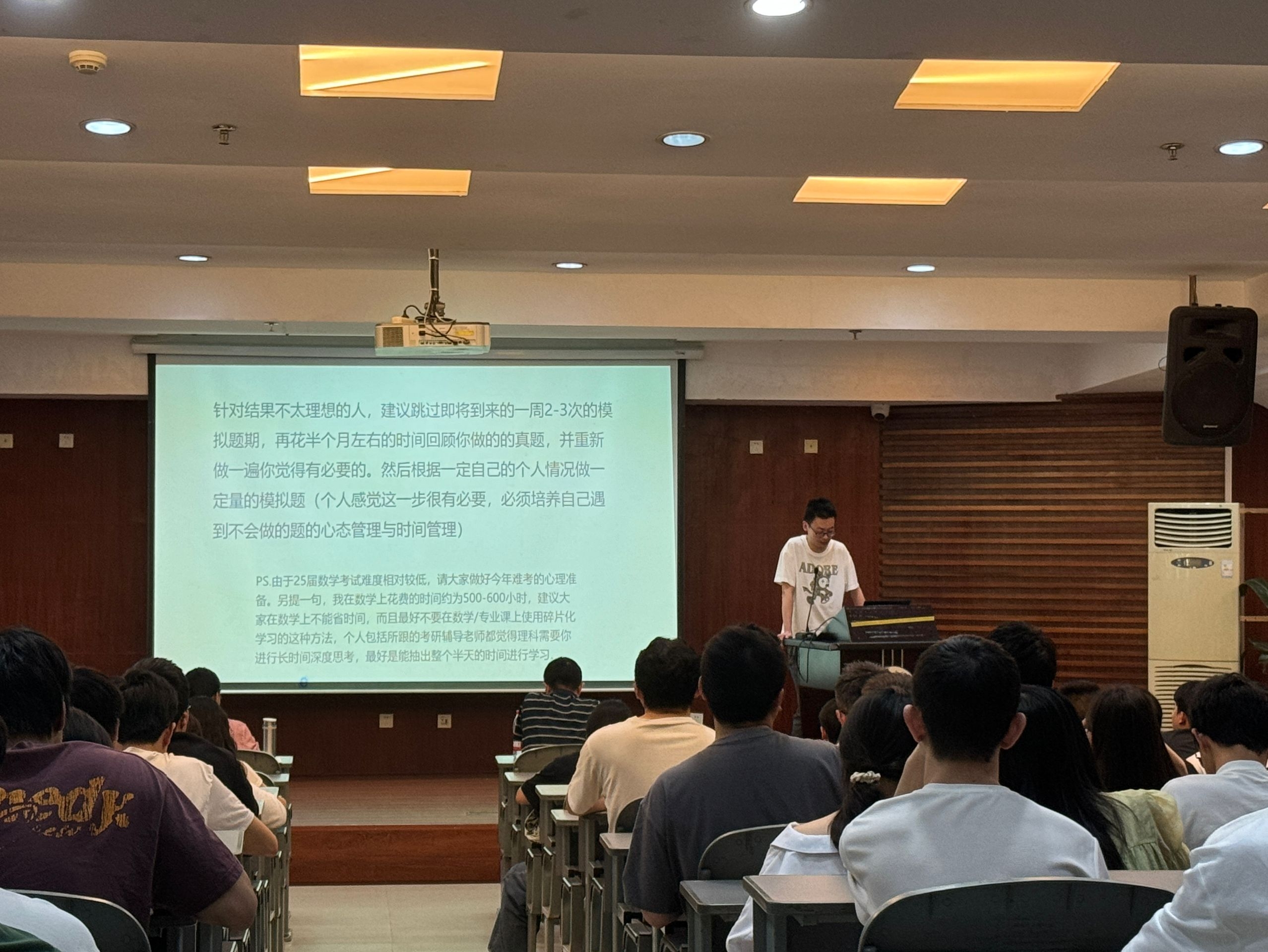 随后,2021级考研成功的牟俊杰、李腾逸、李金凡骥、刘人军四位同学依次上台分享经验。他们分别从各科复习规划与重难点梳理、复试准备与书本推荐、院校及专业的选择与优势分析、复习节奏与作息安排、国家线和调剂资格分析、录取及调剂信息把控等方面,向同学们做了耐心细致的交流。