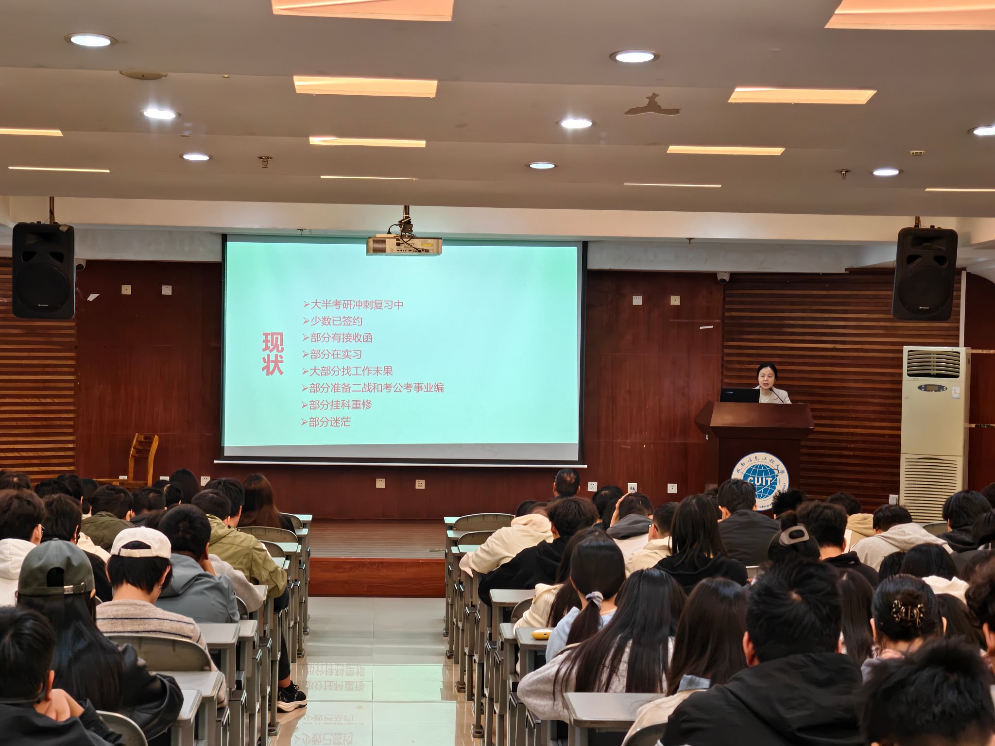 会上,缪燕平结合当前就业市场趋势与学院毕业生求职进展,对同学们的就业现状进行了细致梳理。她深入分析了部分学生暂未落实就业的关键原因,并针对同学们普遍反映的“岗位选择迷茫”“面试通过率低”等困惑与难点,结合企业招聘偏好、行业发展需求分享了实用经验,提供了针对性就业指导。最后,缪燕平对同学们提出殷切期望,鼓励大家克服“怕碰壁、怕失败”的心理,勇敢迈出求职第一步,主动调整心态、积极应对就业挑战,在尝试中积累经验、明确方向。